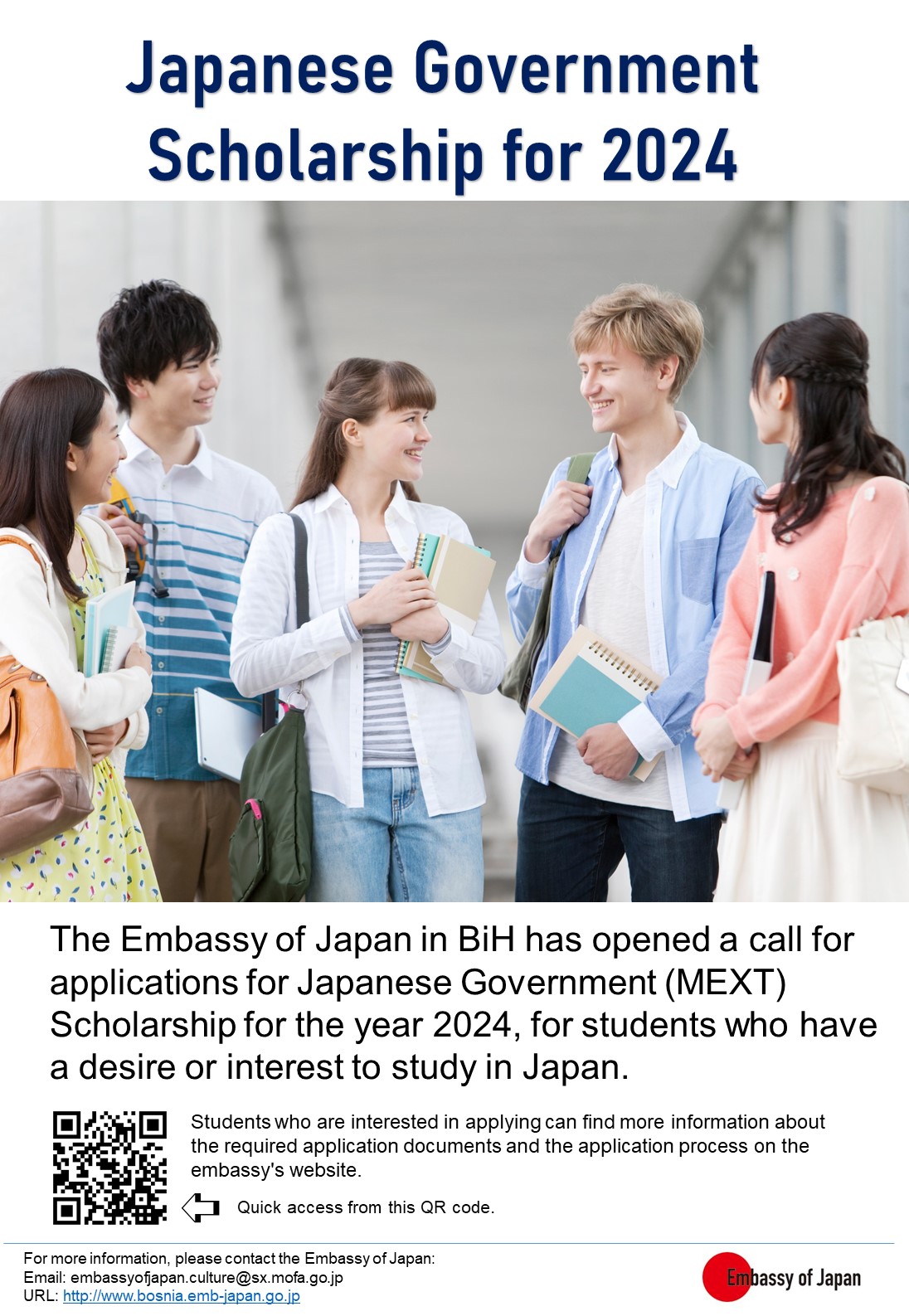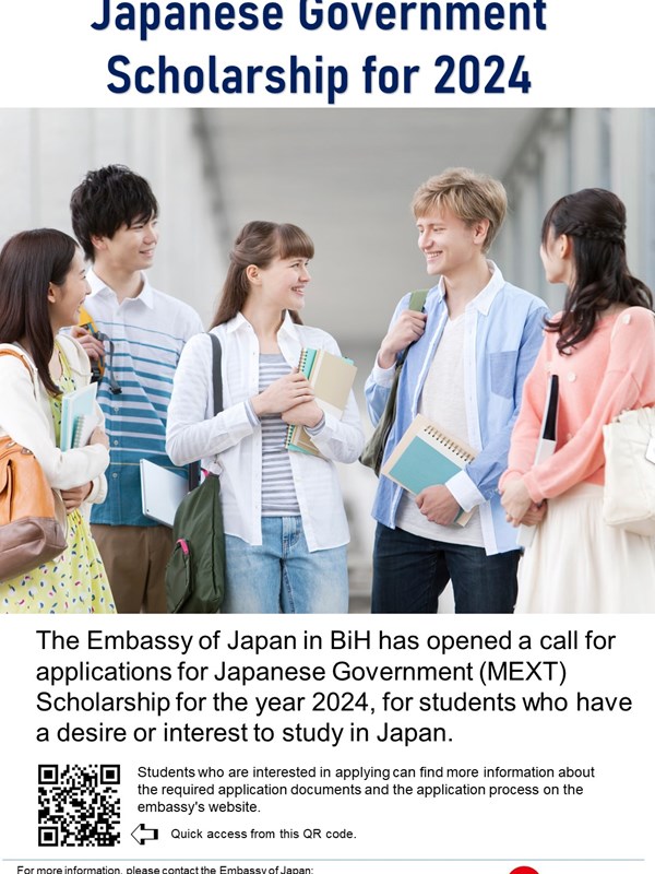 Ambasada Japana u BiH otvorila je konkurs za stipendije Vlade Japana (MEXT) za 2024. godinu, za stipendiranje studenata koji imaju želju ili interes da studiraju u Japanu. Konkurs obuhvata tri studijska programa: postdiplomski istraživački studij (MA, PhD ili bez diplome), dodiplomski studij (bakalaureat) i tehnološki koledž (diplomirano stručno zvanje i / ili bakalaureat). Stipendija pokriva troškove školarine, povratne avio karte, a studenti dobijaju i mjesečni džeparac. Prijave na konkurs moraju stići na adresu ambasade Japana do 26. maja 2023. godine, putem pošte ili ličnom dostavom. Više informacija o potrebnim dokumentima za prijavu i procesu aplikacije svi zainteresovani mogu pronaći na stranici ambasade (LINK: https://www.bosnia.emb-japan.go.jp/itpr_bs/MEXT.html ).